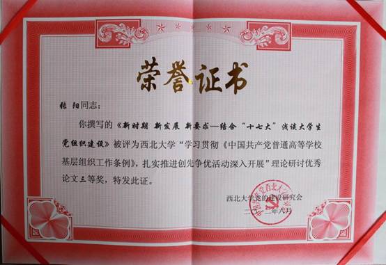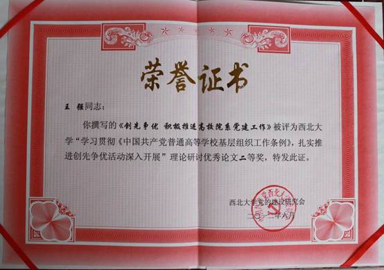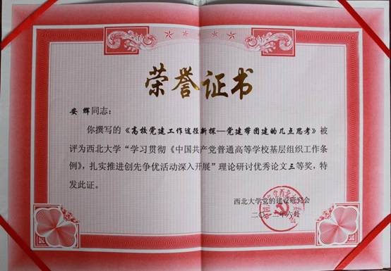 6月26日下午,公司党委在太白校区大礼堂隆重召开“学习贯彻《中国共产党普通高等公司基层组织工作条例》,扎实推进创先争优活动深入开展”征文活动表彰大会。王强书记撰写的《创新争优 积极推进高校院系党建工作》被评为优秀论文二等奖,安辉老师撰写的《高公司党建工作途径新探——党建带团建的几点思考》和2009级本科生张阳撰写的《新时期 新发展 新要求——结合“十七大”浅谈老员工党组织建设》均荣获三等奖;公司党委荣获优秀组织奖。