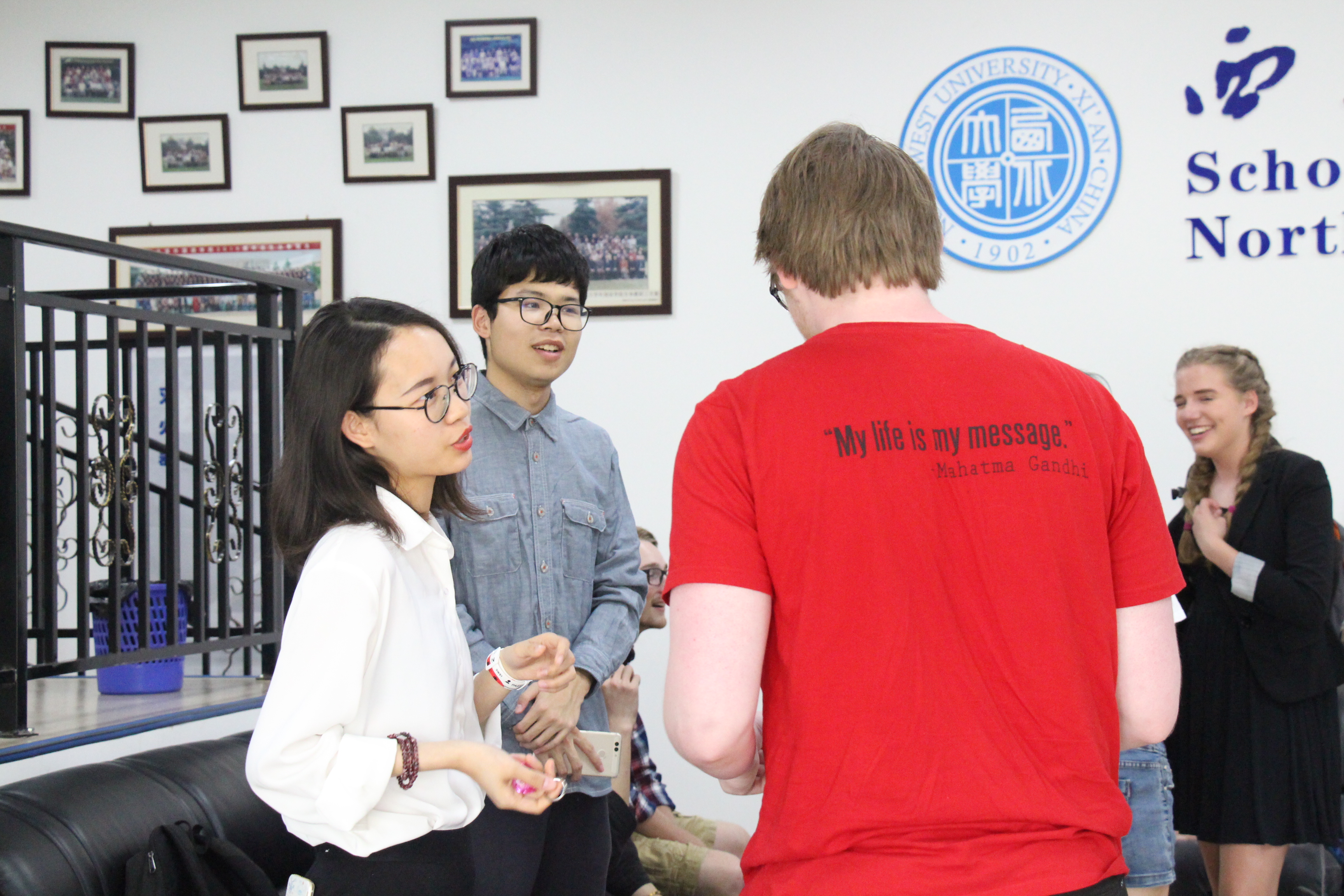 在比赛正式开始前,来自美国西北拿撒勒大学孔子公司的同学们与公司同学展开了友好的交谈,现场氛围十分热烈。