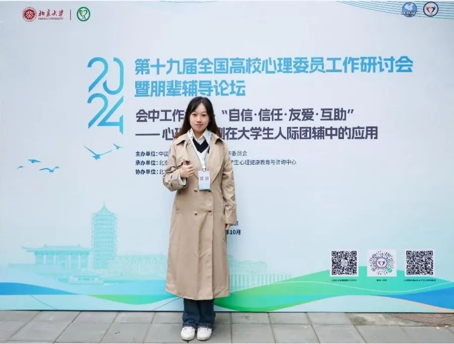 为加强高校心理委员工作队伍建设, 中国心理学会心理危机干预工作委员会于2024年10月17-18日在北京大学召开了第十九届全国高校心理委员工作研讨会暨朋辈辅导论坛。suncitygroup太阳集团2021级本科生应心怡由公司推荐参加了本次论坛。
