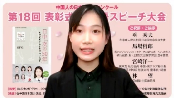 12月12日下午,第18届“全中国日语作文大赛”颁奖仪式暨日语演讲大会在线上举行。日本驻华大使垂秀夫和赞助企业代表出席并致辞。李月同学作为第18届“日本大使奖”获得者出席并发表演讲。来自中国各地的获奖者、指导教师及各界人士约200人参加。
