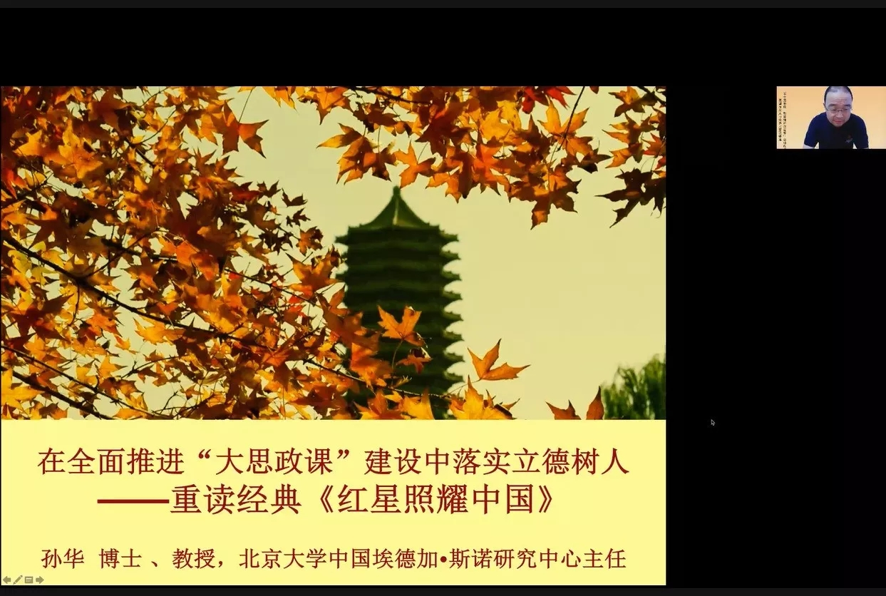 本次讲座主讲人孙华教授,为北京大学中国埃德加·斯诺研究中心主任、北京大学教师教学发展中心主任。 孙华教授以“全面推进‘大思政课’建设中落实立德树人——重温经典《红星照耀中国》”为主题分享了如何将深入领会红色精神,并将其融入课程思政。孙教授讲到: "《红星照耀中国》促进了世界各国和中国之间的相互了解,为世界各国人民了解中国、了解中国共产党和中国工农红军提供了直接的第一手素材。《红星照耀中国》这本书中人物的刻画反映了共产党人的伟大胸襟,反映了他们朝气蓬勃的精神面貌、可歌可泣的动人事迹。这一段是我党历史上非常光辉灿烂的一页,重读经典《红星照耀中国》,以史为鉴,能更好把握当下、赢得未来。结合斯诺著作的重大意义,孙主任建议各个教师应当充分利用公司红色资源,充分调动社会力量,建设"大课堂"、搭建"大平台"、建好"大团队",打造公司特色思政课品牌。