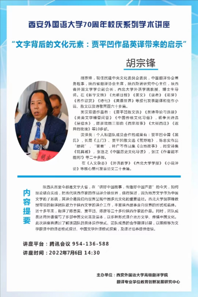 讲座由西安外国语大学高翻公司副经理赵毅慧教授主持,来自国内外的三百多名听众在线上参加了胡宗锋教授的讲座,并在讲座结束后就中国文学的对外译介和胡宗锋教授进行了短暂的互动探讨。