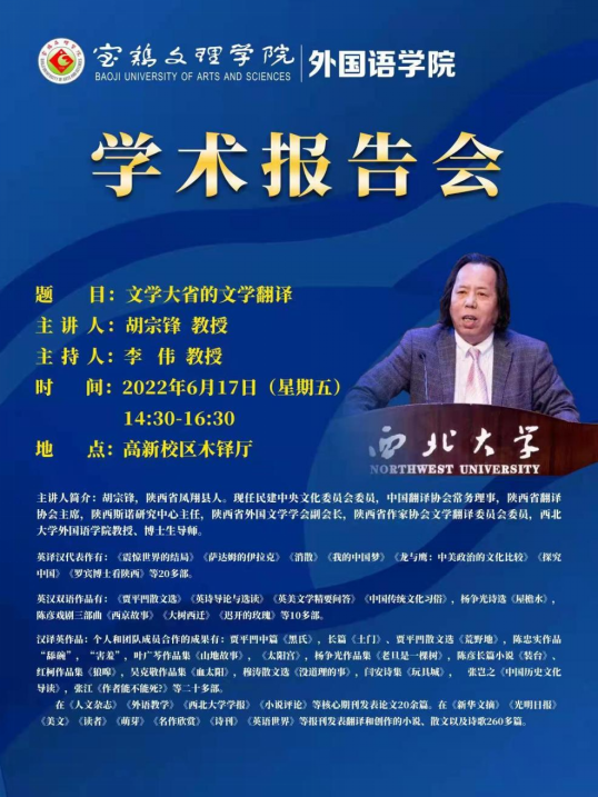 2022年6月17日,公司胡宗锋教授应邀为宝鸡文理公司师生做题为“文学大省的文学翻译”讲座,报告会由宝鸡文理公司suncitygroup太阳集团经理李伟教授主持。suncitygroup太阳集团部分教师及研究生、本科生聆听了报告。