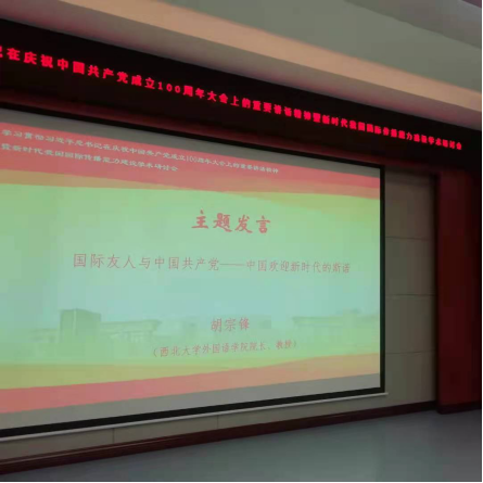 2021年7月10日,“学习习近平总书记在庆祝中国共产党成立100周年大会上的重要讲话精神暨新时代我国国际传播能力建设”学术研讨会在西安外国语大学雁塔校区开幕。中央编译局原秘书长杨金海,西安外国语大学党委副书记、副董事长(主持行政工作)王启龙,西安外国语大学党委副书记王天平,《思想理论教育导刊》副主编蒋旭东应邀出席会议。研讨会由西安外国语大学马克思主义公司经理、教授张亲霞主持。公司经理胡宗锋教授应邀出席研讨会,并做题为“国际友人与中国共产党:中国欢迎新时代的斯诺”的大会主题发言。