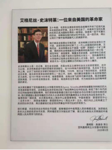 亚利桑那州立大学图书馆馆长Jim O’Donnell表示,史沫特莱的伟大事迹成功地在中国和美国之间找到了共同的事业和利益,他希望此次展览能够给人们带来新的启示。Jim呼吁,“在21世纪中,我们将会建设一个更加和平、健康和洁净的星球。”