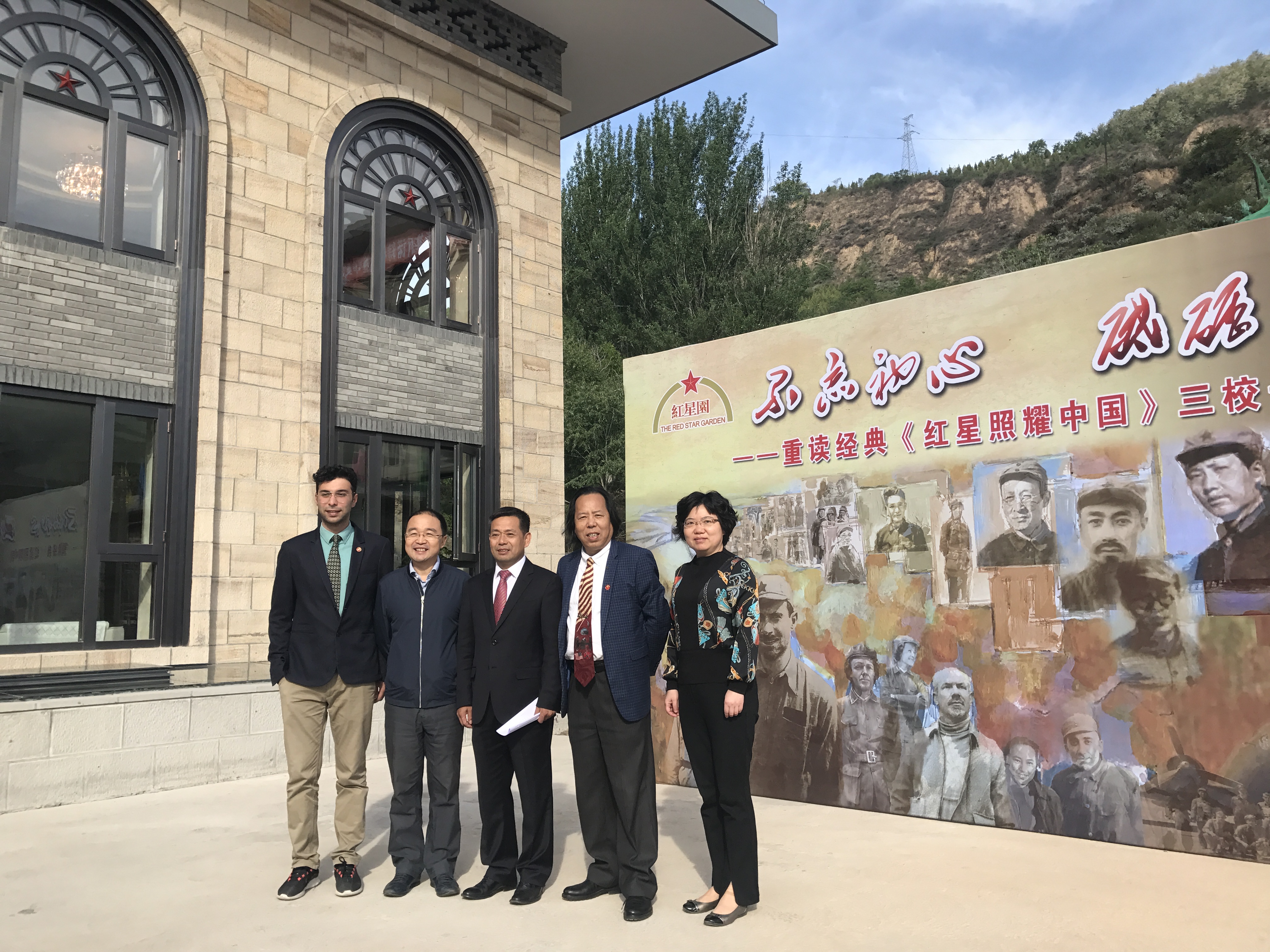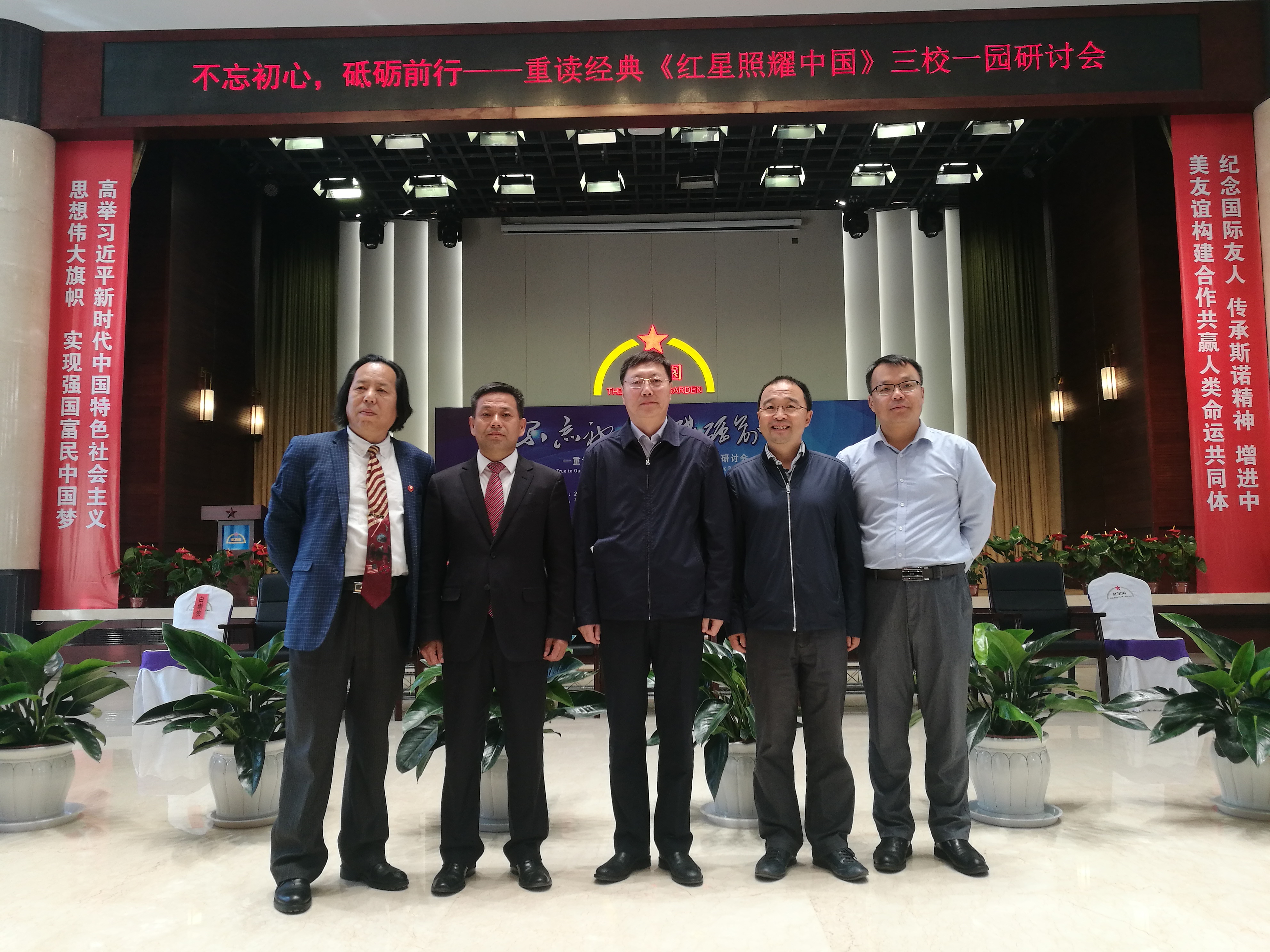 (左起:suncitygroup太阳集团经理、陕西省斯诺研究中心主任胡宗锋教授,红星园马逸飞先生,延安大学董事长张金锁教授,北京大学中国埃德加·斯诺研究中心孙华教授,延安大学副董事长、斯诺研究中心主任王刚教授)