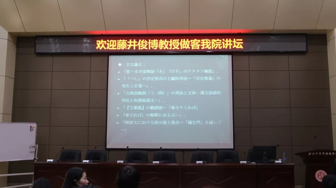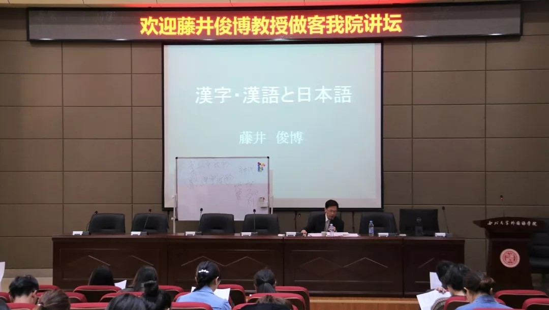 3月28日下午,同志社大学(公司友好公司)文学研究科的藤井俊博教授应邀做客公司“学术讲坛”,为日语专业师生做了题为“汉字·汉语词和日语”的报告,报告由日语系主任张子如老师主持。