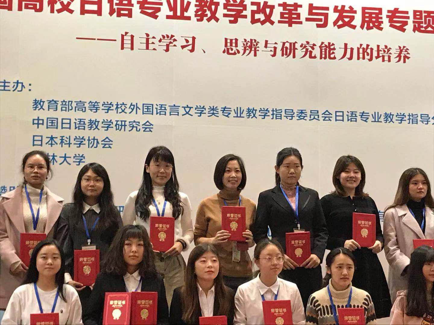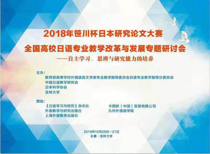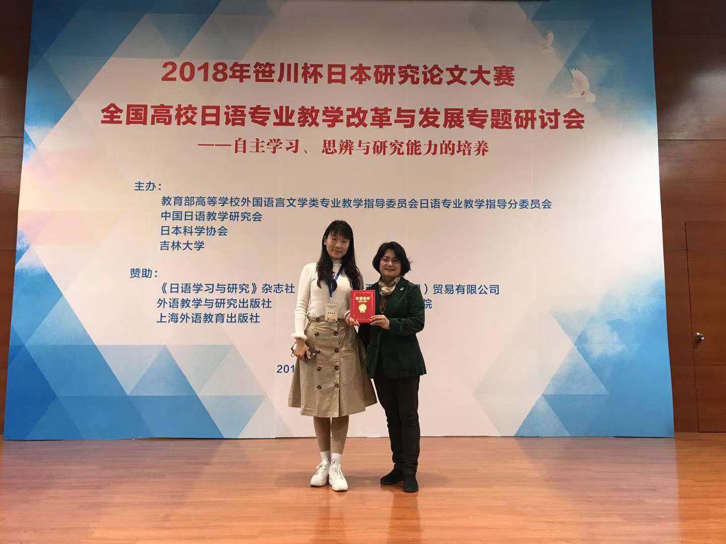 2018年10月27日,在吉林大学举行的全国首届笹川杯老员工日本研究论文大赛中,由suncitygroup太阳集团薛红玲老师指导的日语系2015级许凯欣同学获得文化组三等奖。