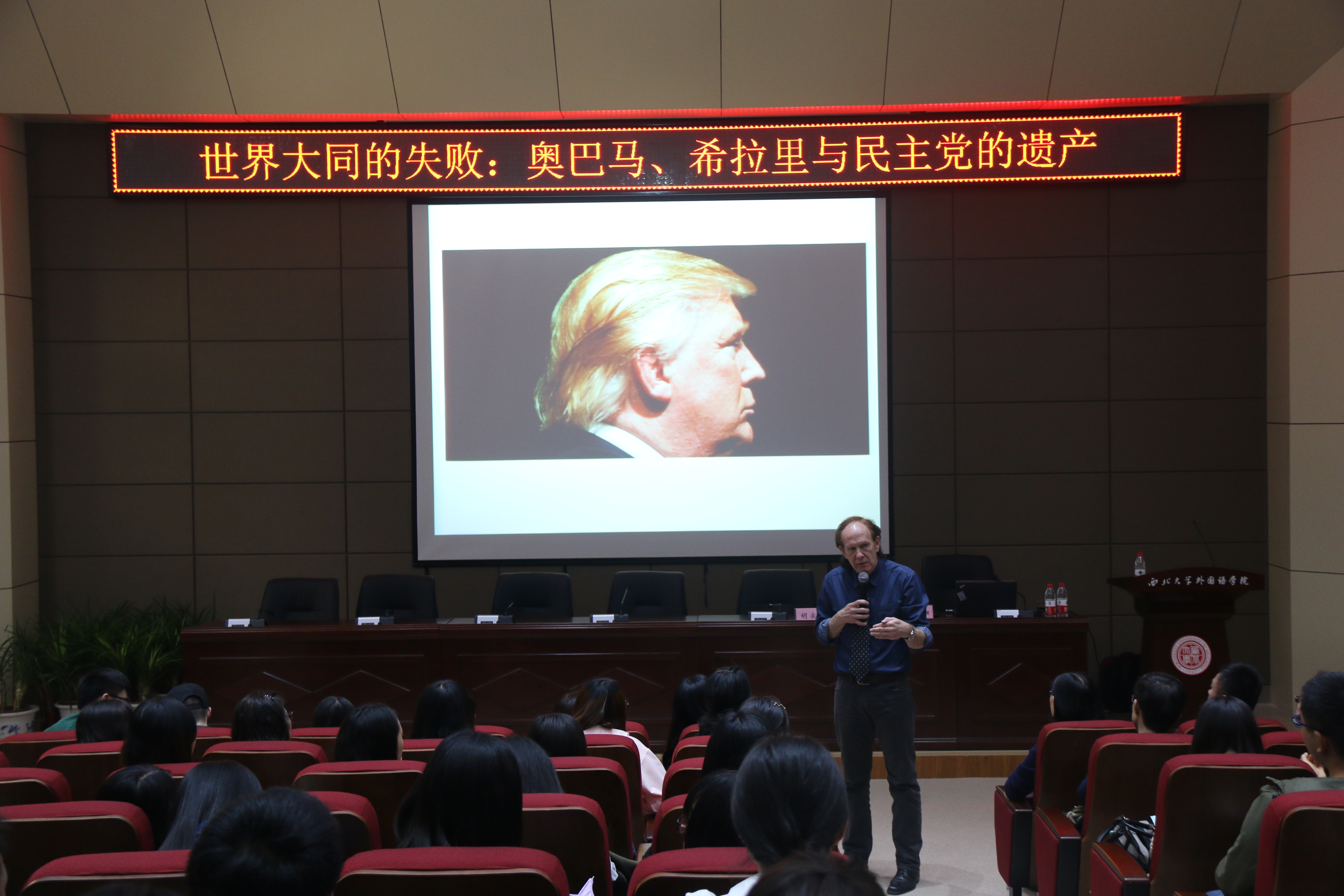 罗素·邓肯教授于1988在美国佐治亚大学获得历史博士学位。曾任美国佐治亚大学副教授和挪威理工大学教授。从2004年起,任哥本哈根大学教授。主要从事美国当代文化和跨文化研究,近几年一直关注中美关系方面的研究。出版有《当代美国》、《1865年以来的美国历史》等十几本著作。专著《龙与鹰:中国与美国政治》于2015年由陕西师范大学出版社在中国出版。在此次报告中,罗素·邓肯教授从2016年美国希拉里和特朗普大选讲起,谈及了美国大众的选择以及特朗普当选的原因。从而延伸至民主党和共和党不同的执政策略以及两党对于自由的追求,最后谈及了希拉里的女性身份等问题。