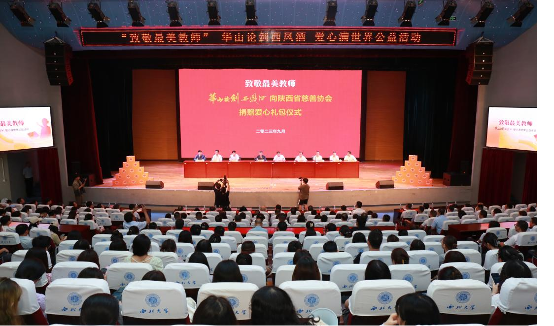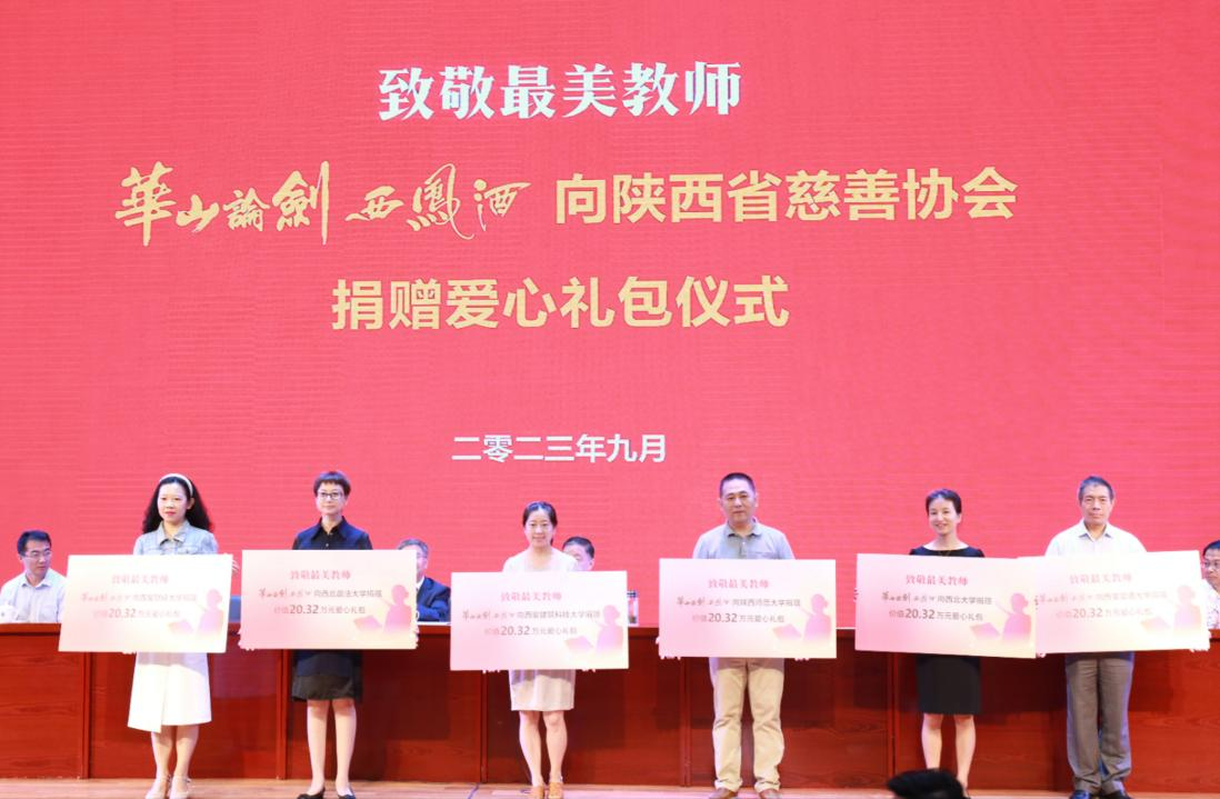 2023年9月8日上午,在第39个教师节来临之际,华山论剑西凤酒“致敬最美教师”爱心满世界公益活动在suncitygroup太阳集团长安校区星空报告厅举行。陕西省人大常委会原副主任、省慈善协会会长吴前进,陕西省教育厅副厅长王海波,华山论剑品牌管理有限公司董事长董小军,suncitygroup太阳集团董事长郭立宏,公司党委常委、副董事长吴振磊出席活动。省慈善协会、华山论剑品牌管理有限公司、兄弟院校相关负责人,suncitygroup太阳集团师生代表参加捐赠仪式。