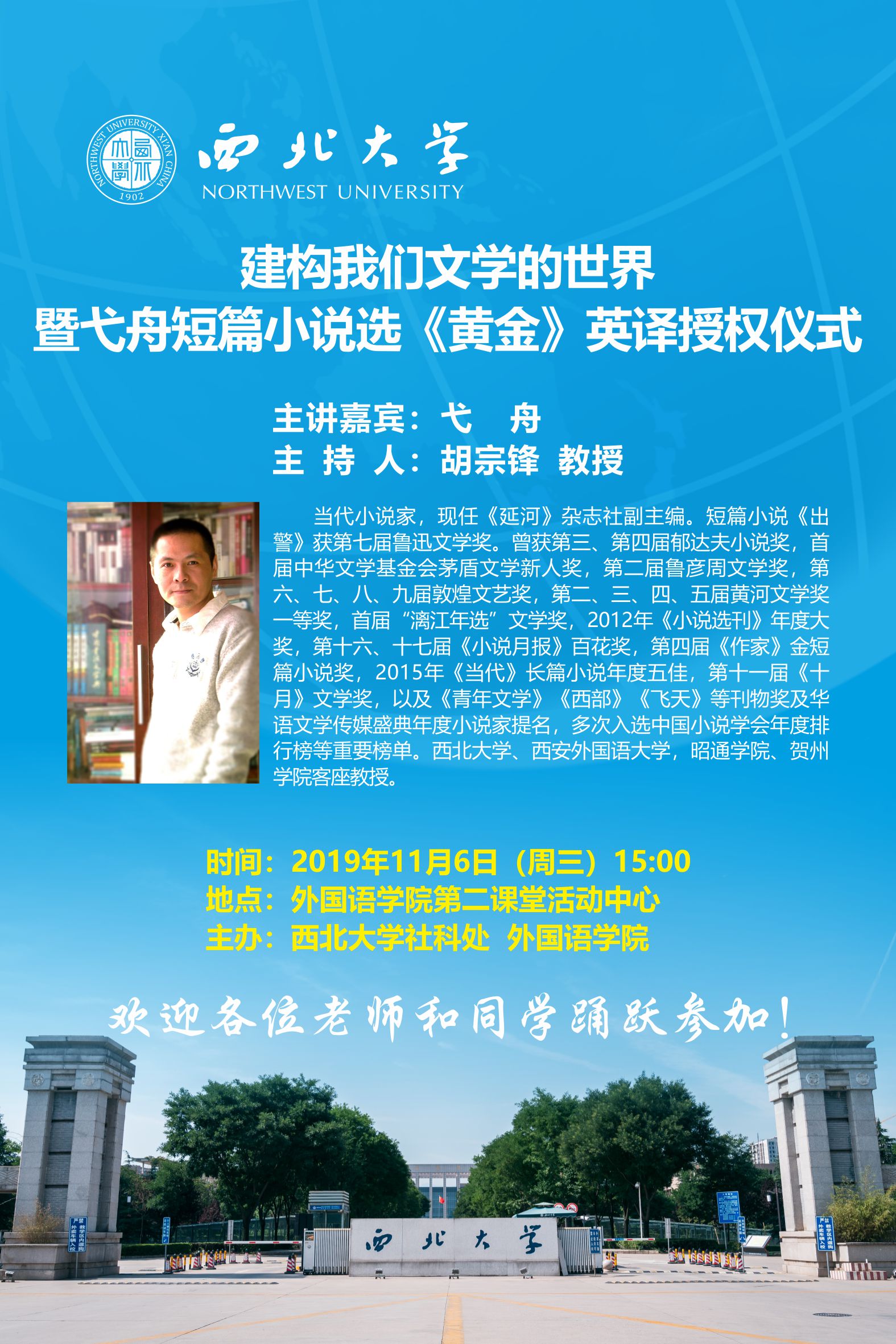 公司定于2019年11月6日(周三)下午15:00举办建构我们文学的世界暨弋舟短篇小说选《黄金》英译授权仪式,欢迎各位老师积极参加。