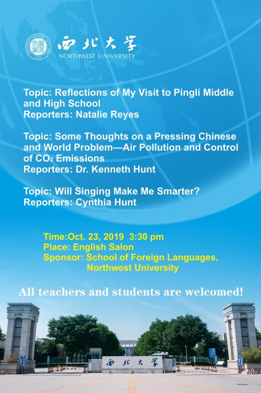 公司定于2019年10月23日(周三)下午15:30举办由外籍专家Natalie Reyes、Dr.Kenneth Hunt、Cynthia Hunt分别主讲的三场学术报告,欢迎各位老师积极参加。