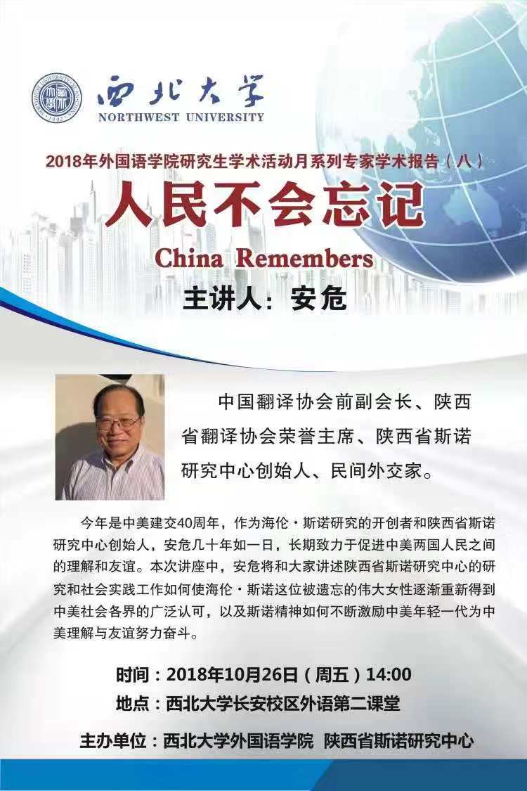 公司定于2018年10月26日(周五)下午14:00召开《人民不会忘记》学术报告及第七届海伦·斯诺翻译奖竞赛颁奖仪式暨“中美理解与友谊树”植树一周年纪念,请全院教职工准时参加。